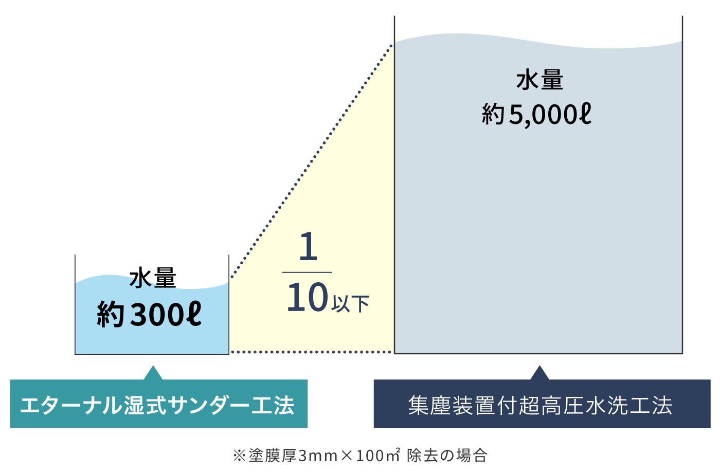 水は再利用することが可能で、使用水量は集塵装置付超高圧水洗工法の10分の1以下に収める事が可能です。