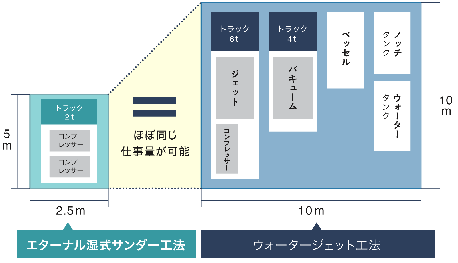 集塵装置付超高圧水洗工法に比べ、機械設置の場所が少なくてすみます。